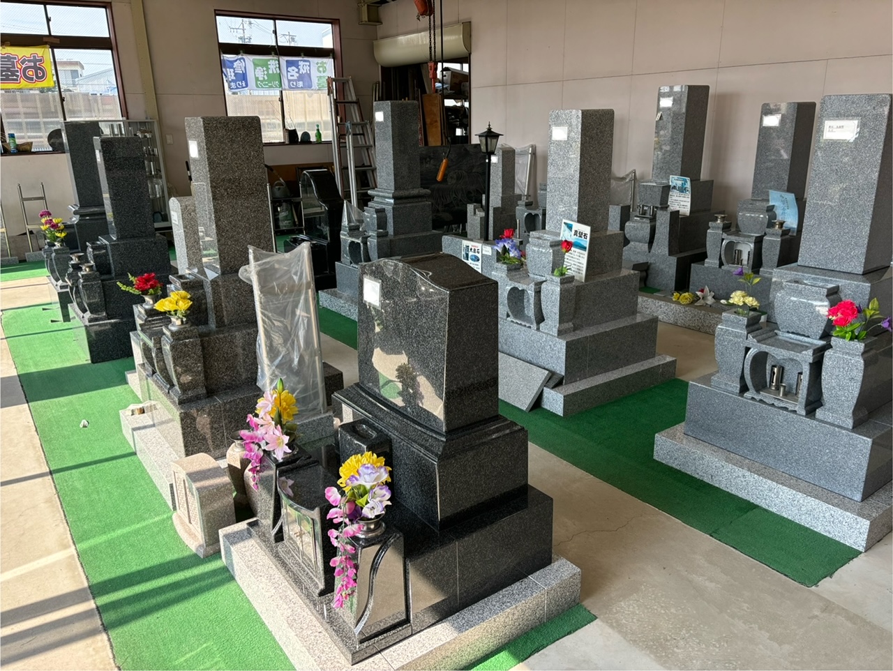 (有)大島石材は40万円の墓石から国産最高級石材の庵治石まで幅広くショールームにて展示しておりますので実際にご覧になり選んでいただけます。また、最も標準的な和式名古屋型から洋型墓石や一般的な形式にとらわれない個性的なデザインの墓石まで様々な型に対応します。お見積もりは無料でおこなっておりますので、ご希望のイメージ、ご予算等何でもご相談ください。